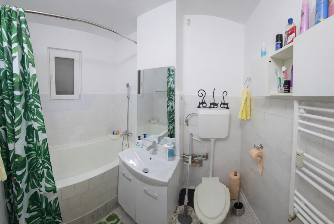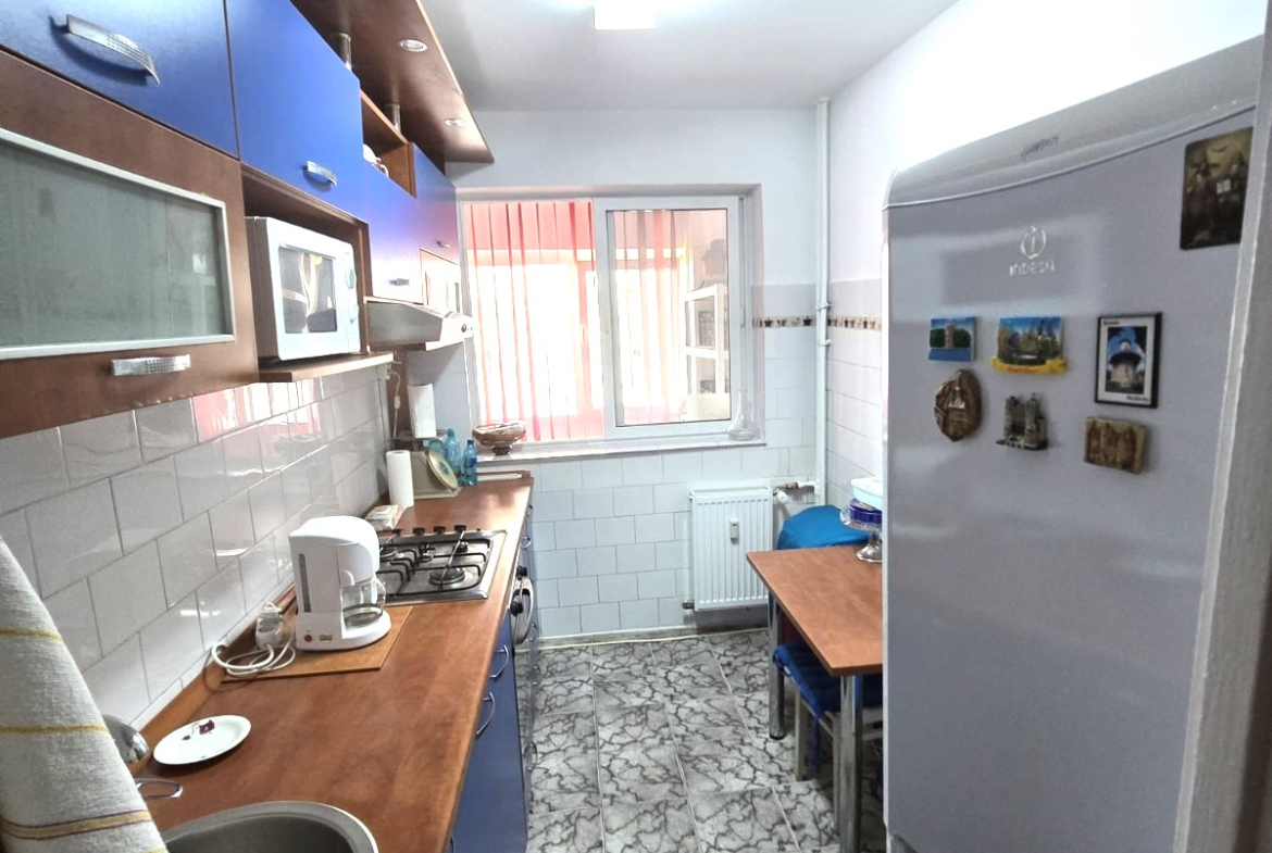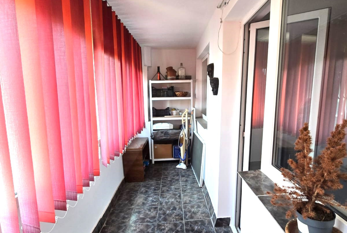 COMPARTIMENTARE: Living luminos cu acces către balconul închis cu termopan, care se continuă pe bucătărie. Bucătăria este separată și complet mobilată. Baia este prevăzută cu cadă și geam pentru aerisire. Holurile includ cămară și debara pentru depozitare.