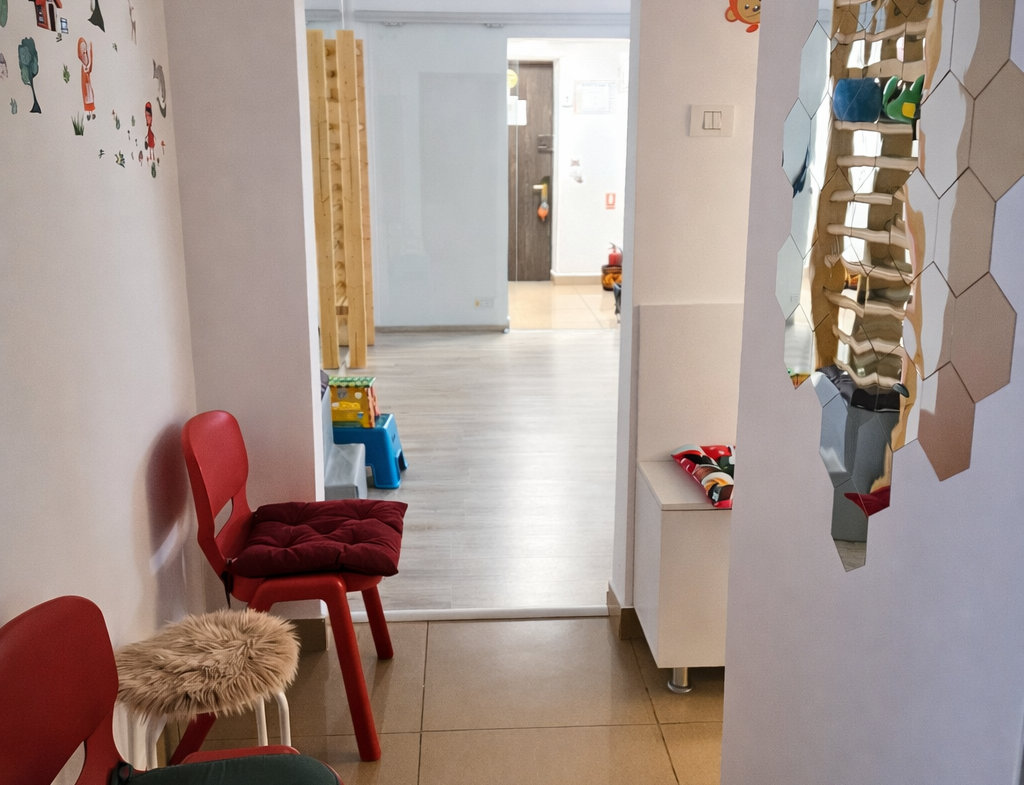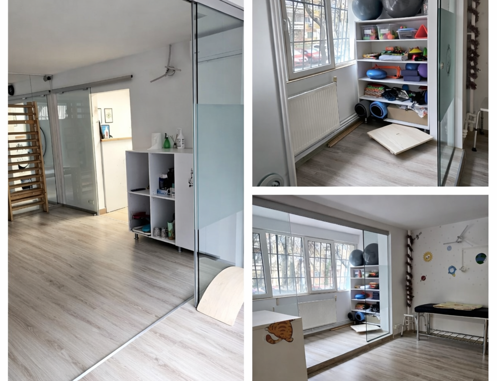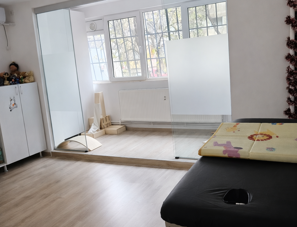 COMPARTIMENTARE: Spațiul permite desfășurarea simultană a mai multor activități specifice kinetoterapiei pediatrice, cu flux bine organizat pentru pacienți și aparținători.